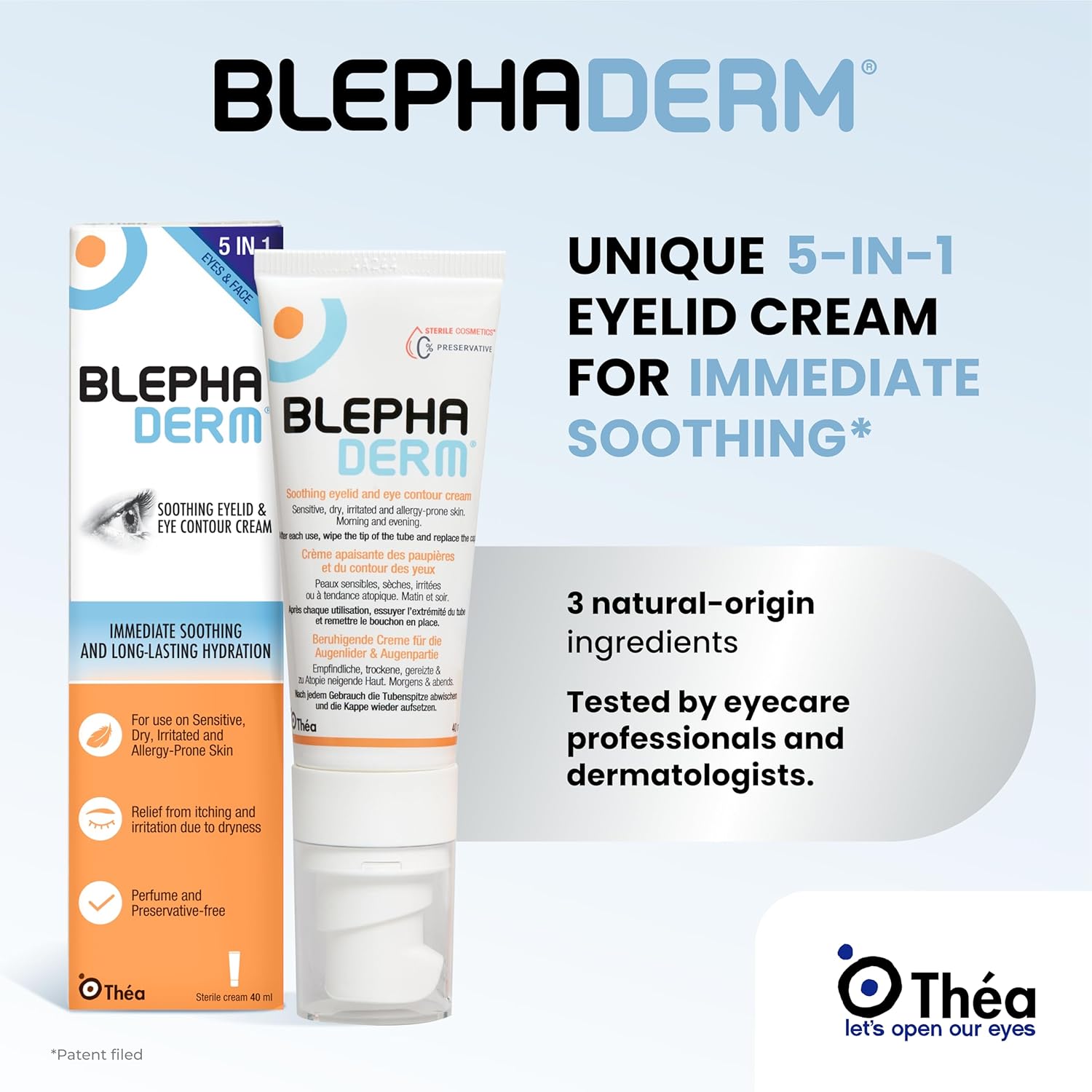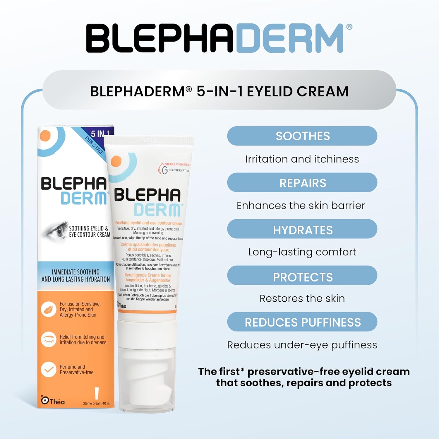 BlephaDerm® est la première crème pour les paupières sans agent de conservation qui apaise, protège et répare. Il s’agit d’une crème apaisante pour les paupières et le contour des yeux qui procure un effet hydratant immédiat et une hydratation longue durée pour les peaux sèches. Elle aide à soulager les rougeurs dues à la sécheresse, les sensations de démangeaison et à réduire les poches sous les yeux.